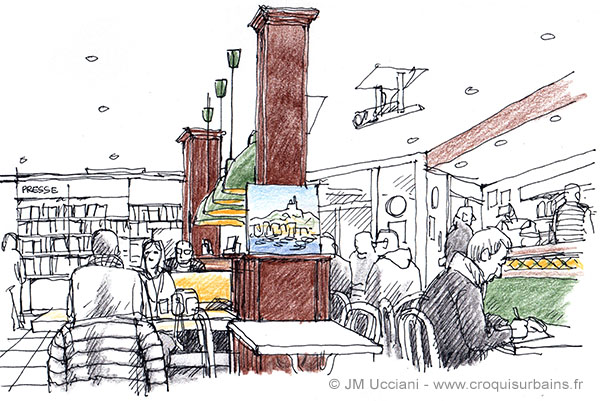 Vue de la place d’arme. Esquisse aquarelle et crayon format 21/29,7.