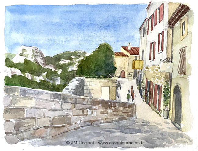 À Eygalières, les vieilles pierres se mélangent aux habitations dans la partie ancienne du village. Dessins de 2025 et de 2019.