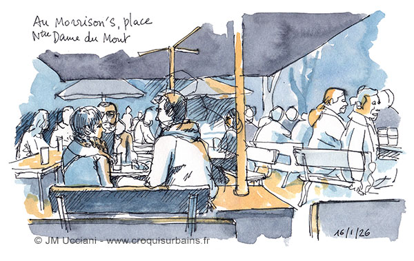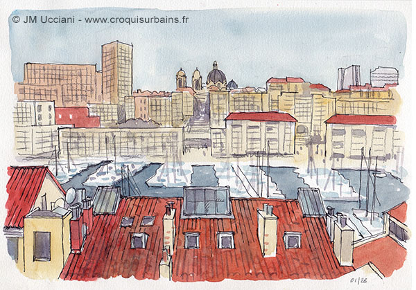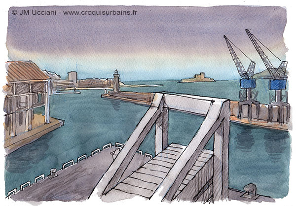 La Digue du Large est une digue qui protège les bassins de la Joliette au Port de Marseille. Ci-dessous sous un ciel d’hiver. Stylo et aquarelle format A4.