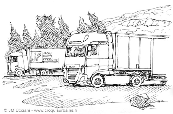 Camion semi-remorque sur un relais routier au bord de la Nationale 7. Dessin au roller format A4.