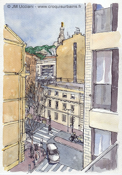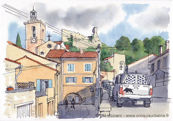 Vue de la place d’arme. Esquisse aquarelle et crayon format 21/29,7.