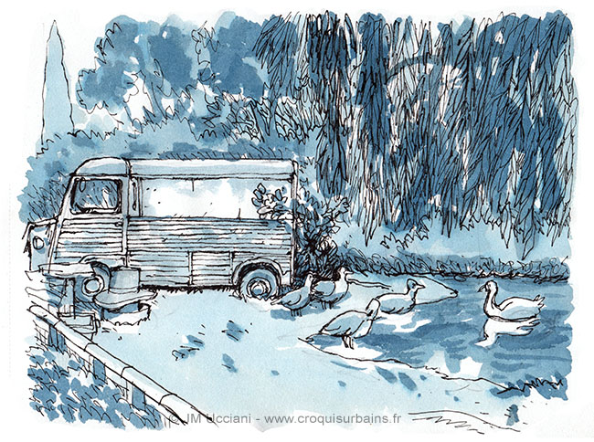Camion frigorifique de producteur de fleurs. Croquis sur le vif, stylo plume et crayons de couleur.