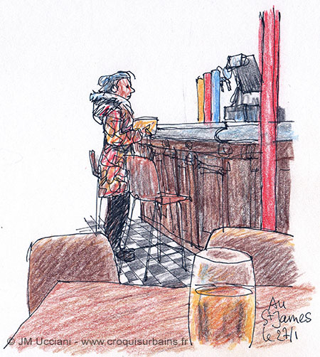 Salle et comptoir. Interprétation dessinée au stylo plume et crayon de couleur sur papier à grain 120 grammes format 21/17 cm.