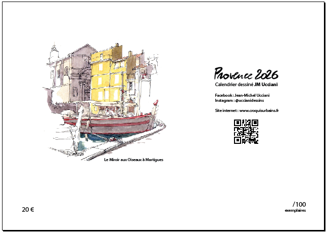 Calendrier mural avec reliure par agrafage, 28 pages en couleur sur papier 170 grammes, format A4 fermé, A3 ouvert. Tirage limité à 100 exemplaires numérotés.