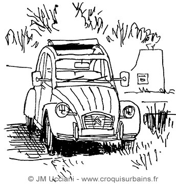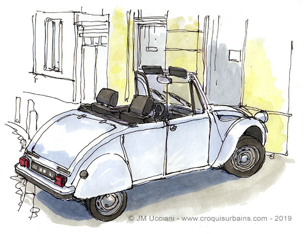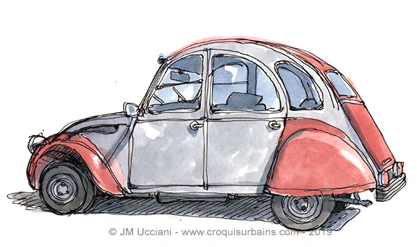 Camion frigorifique de producteur de fleurs. Croquis sur le vif, stylo plume et crayons de couleur.
